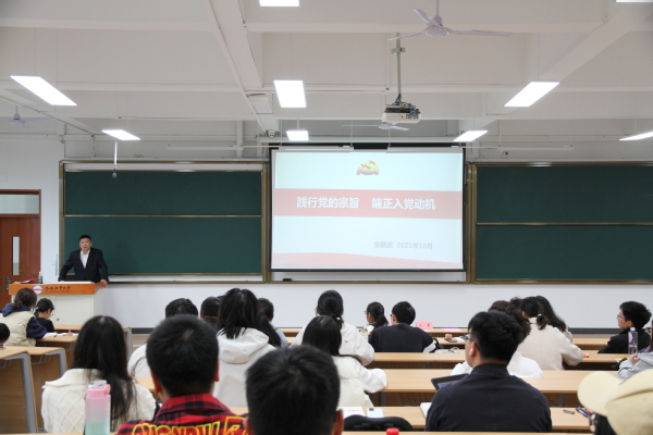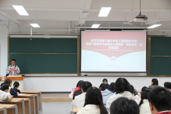 2025年10月29日下午,经济学院第74期大学生入党积极分子班暨第17期青年马克思主义者培养“经世济民”班开班仪式在翡翠湖校区翠八教109举行。经济学院党委书记、分党校校长张炳武,副处级组织员凡菊,积极分子班班主任曹力文及全体学员参加仪式。