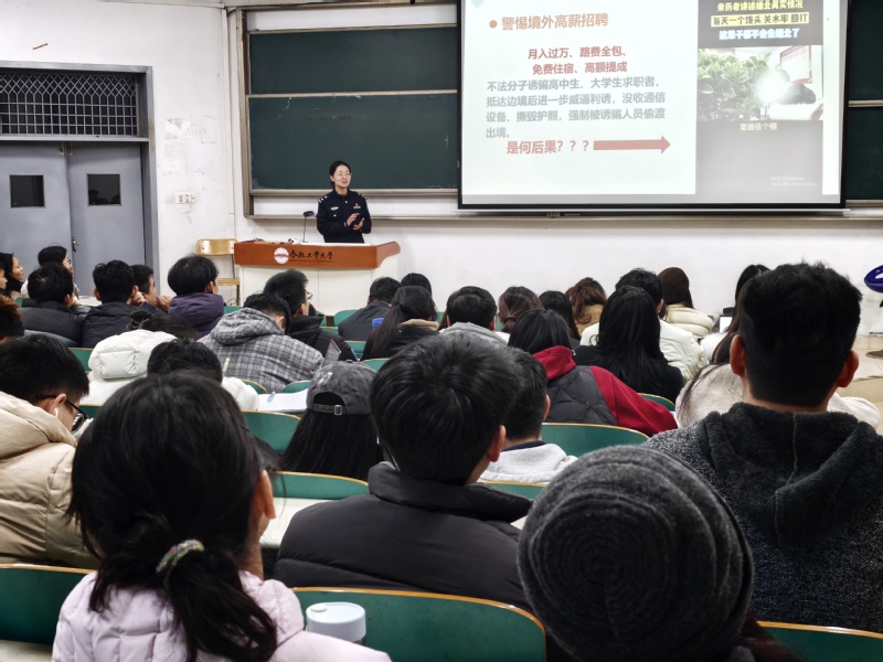 叶荣菁结合近期诈骗案例点明当前电信诈骗严峻形势,引出反诈主题。经开分局警官郑睿杰围绕诈骗概念与形式、高发类型、防范沦为诈骗工具人三个模块展开讲解,通过区内警情数据直观呈现诈骗态势,剖析网络刷单、虚假购物、冒充熟人借钱等常见骗局;针对高校频发的网络交友“桃色陷阱”,结合真实案例进行详细解读,并提醒同学们警惕“境外高薪招聘”骗局,避免沦为诈骗犯罪工具。