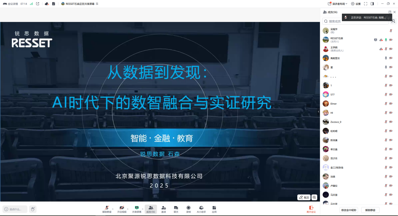 2026年3月18日下午,由经济学院实验中心主办的新文科数字资源推广系列专题讲座第十三讲顺利举行。本次讲座以“从数据到发现:AI时代下的数智融合与实证研究”为主题,特邀锐思数据高级培训师石森担任主讲,80余名师生齐聚线上,共赴这场数据科学的思想盛宴。