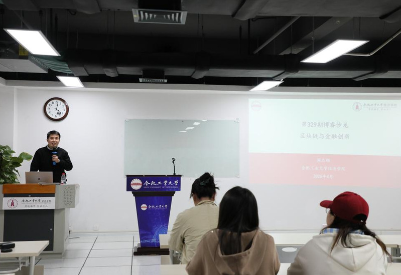 2026年4月21日下午4点,经济学院研究生会在翡翠湖校区科教楼B座1004室成功举办合肥工业大学第329期博睿沙龙活动。活动邀请到经济学院教授周志翔老师做学术交流分享,经济学院学生工作办公室主任叶荣菁老师与80余名研究生参与本次活动,本次活动的主题为“区块链与金融创新:那些被忽视的前沿与真相”。