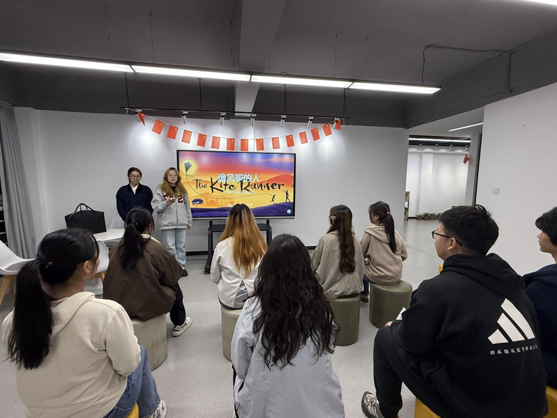 活动伊始,主持人结合个人阅读感悟,梳理作品创作背景与人物关系。随后,主持人带领大家观看经典影视片段,解读“风筝”等核心意象的象征内涵,引导大家多维品读作品主旨。互动环节中,同学们踊跃发言、各抒己见,现场交流氛围浓厚。